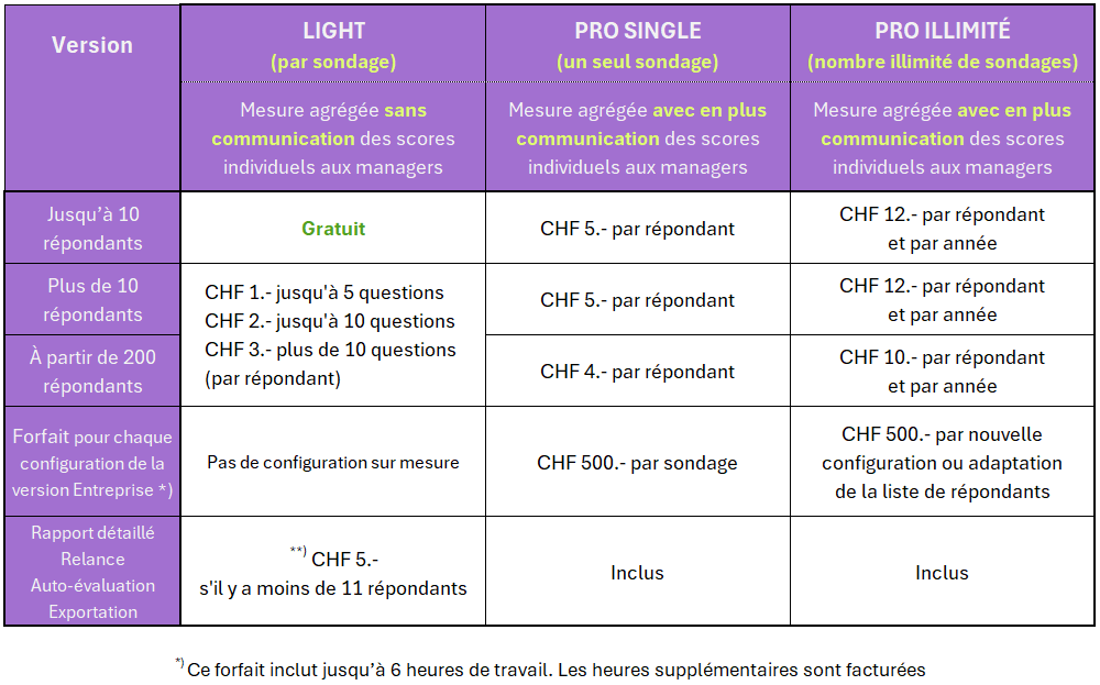 | Impossibilité pour la hirérarchie ou les RH d'avoir accès aux résultats à part la moyenne anonyme de tous les scores consolidés | ✔ | ? | ? |